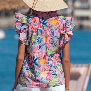 Pink Tropical Floral Print Frilly Notched Neck Ruffled Short Sleeve Blouse