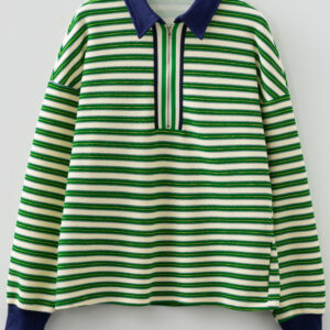 Dark Green Striped Print Contrast Collar Zip V Neck Long Sleeve Top