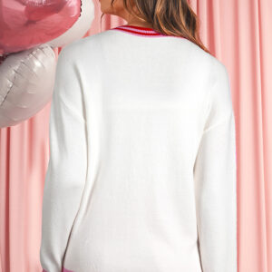 White Striped Trim Bow Graphic Round Neck Drop Shoulder Sweater