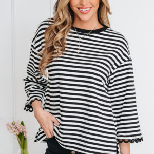 Black Striped Print Drop Shoulder Lace Trim Bracelet Sleeve Loose Top