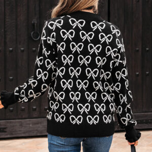 Black Cute Bow Pattern Drop Shoulder Zipped Collar Sweater
