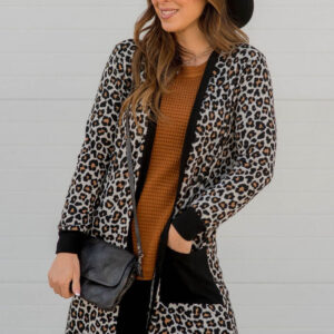 Dearlovers Brown Leopard Pattern Lace Ribbed Detail Button Cuffed Sweater