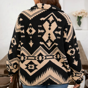 Black Plus Size Western Aztec Pattern Half Button Collared Plush Sweatshirt