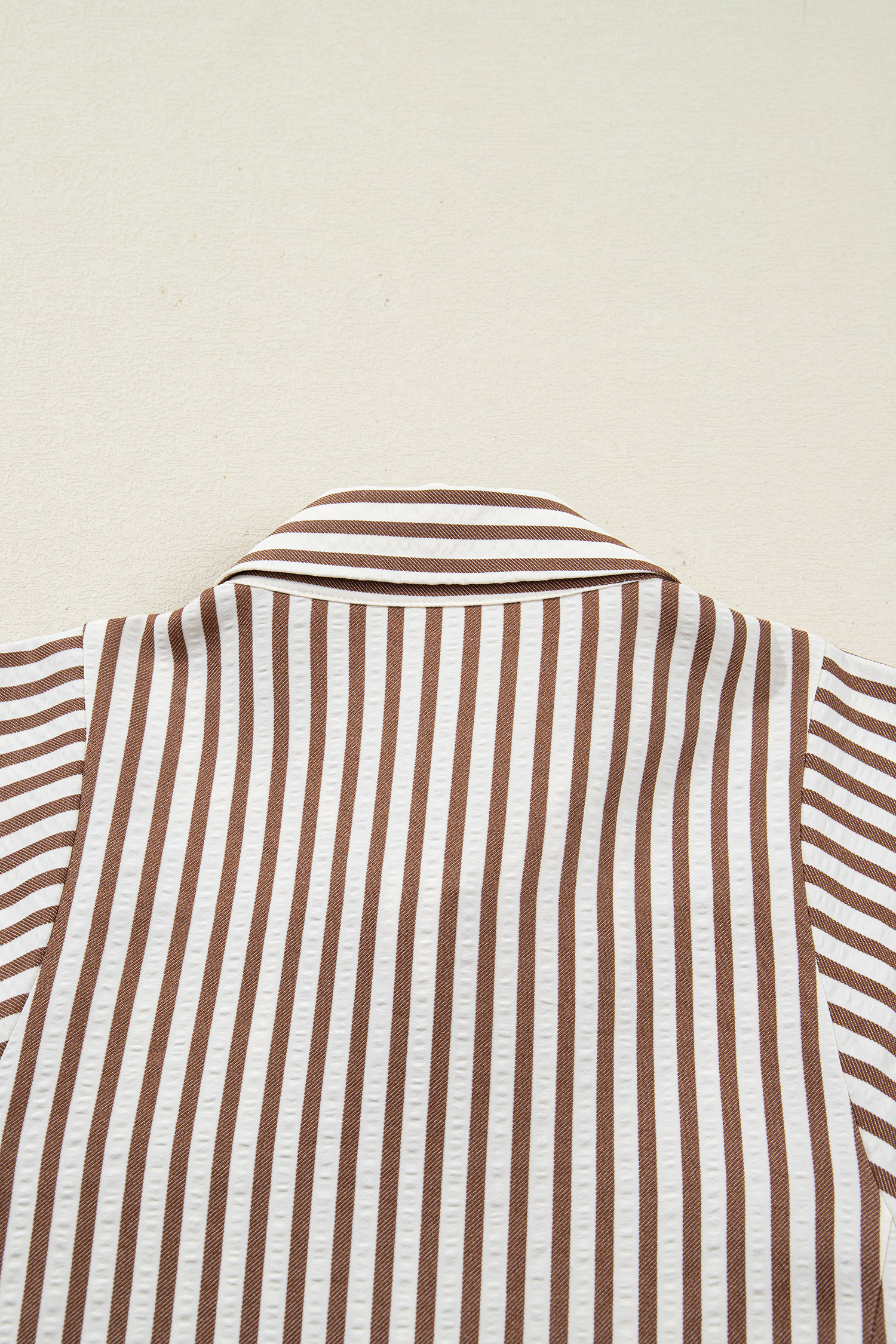 Brown Stripe Knot Waist Puff Sleeve Button Down Mini Shirt Dress