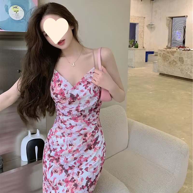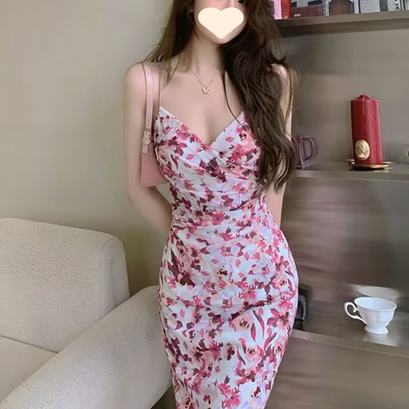 V-Neck Sleeveless Floral Print Fitted Long Dress