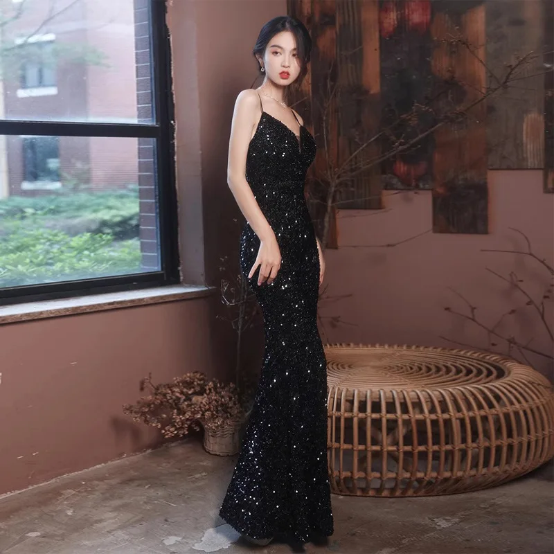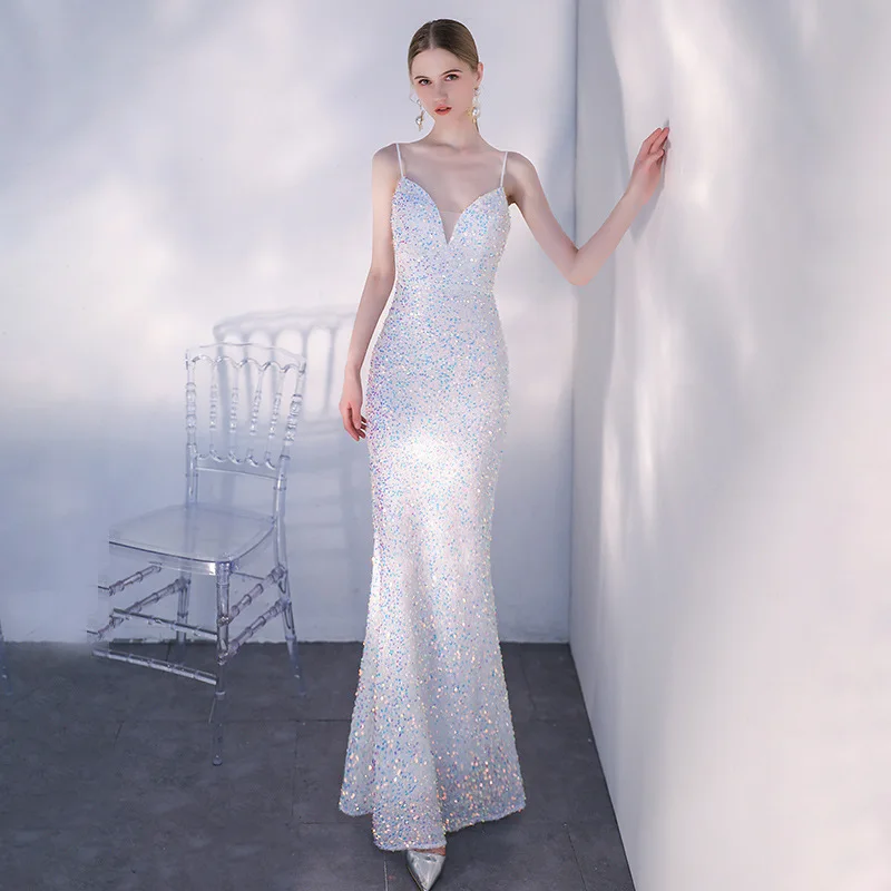 Golden Temperament Lady Sequined Sling Fishtail Skirt Sexy Catwalk Wedding Dress
