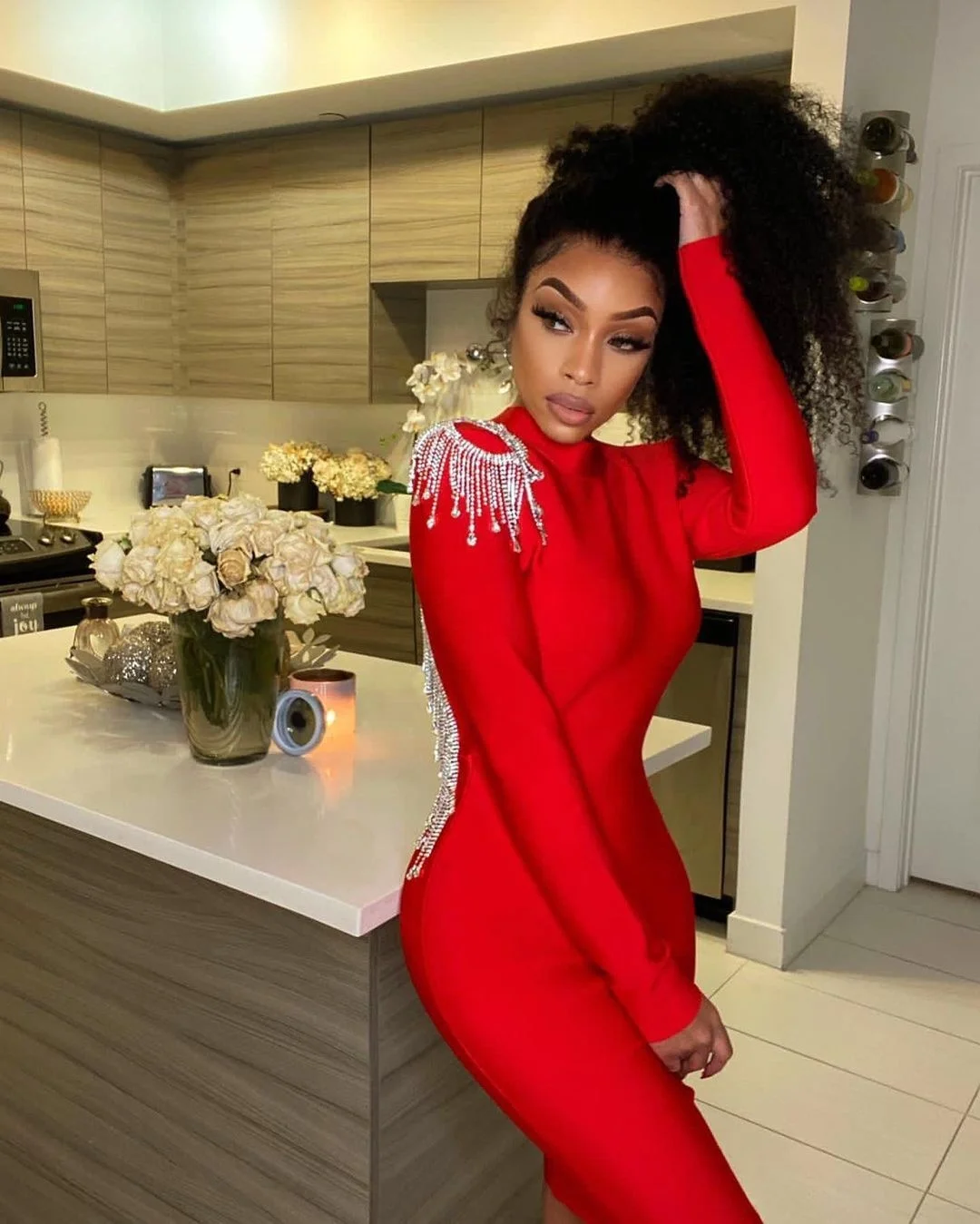 OUDINA Women Clothing Fashion Hollow Tassel Backless Bodycon Dresses Women Rhinestone Bandage Dress