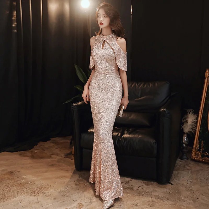 V-neck Heavy Sequin Texture Fishtail Sexy Hot Selling Evening Dress
