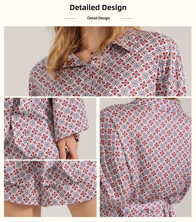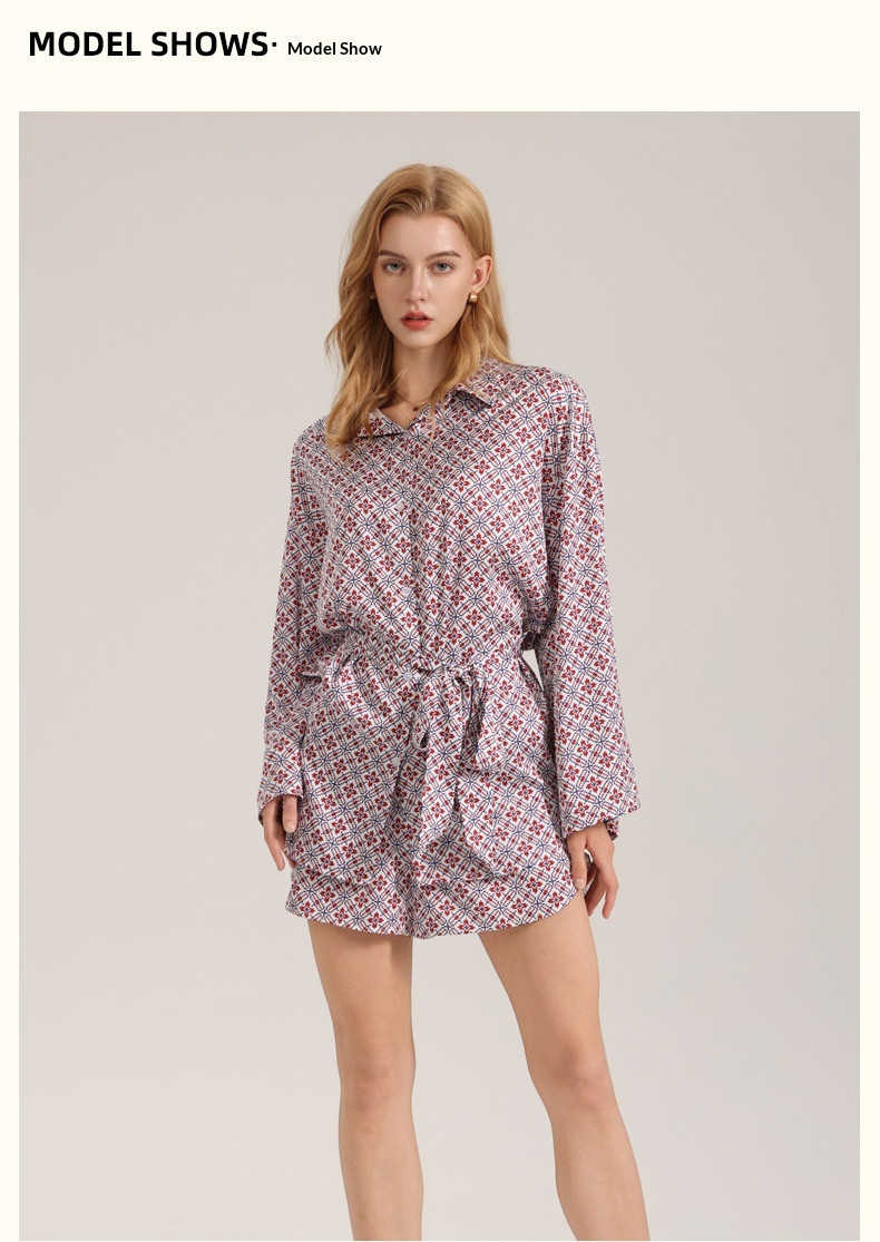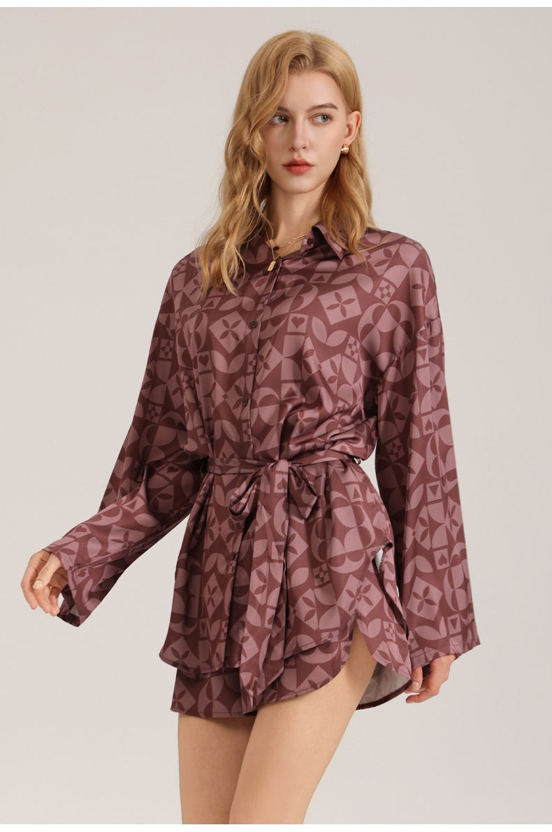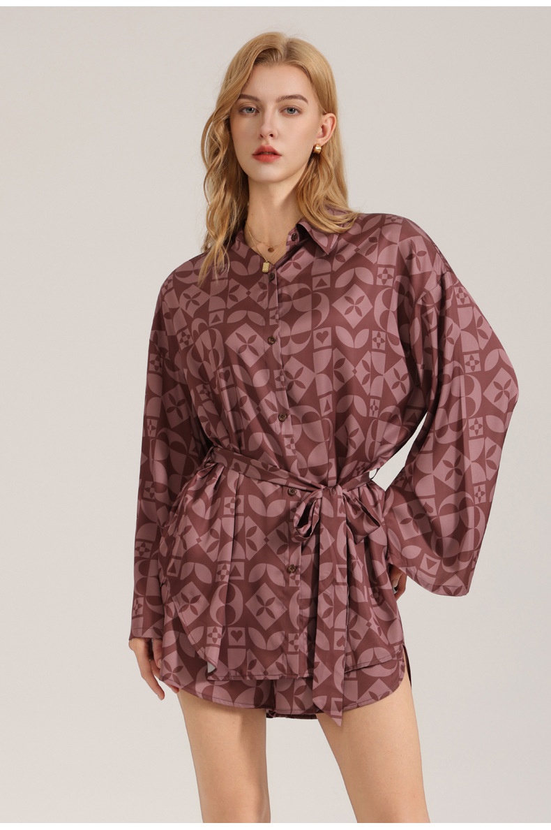 Retro-style Satin Long-sleeve Shorts Set For Women Fashionable Geometric-print Pajamas And Loungewear