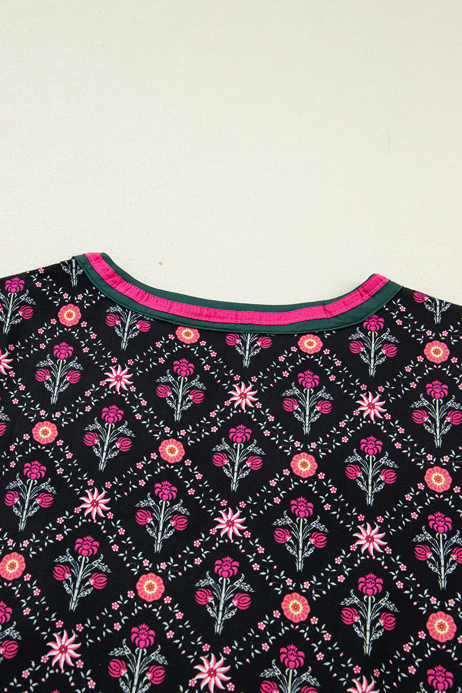 Contrast V neckline flatters the upper body.