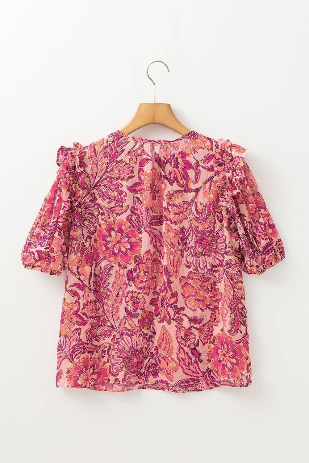 Red Floral Print Ruffled Puff Short Sleeve Blouse