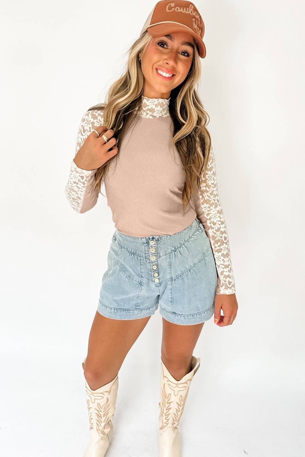 Beige Floral Lace Patchwork Long Sleeve High Neck Slim Top