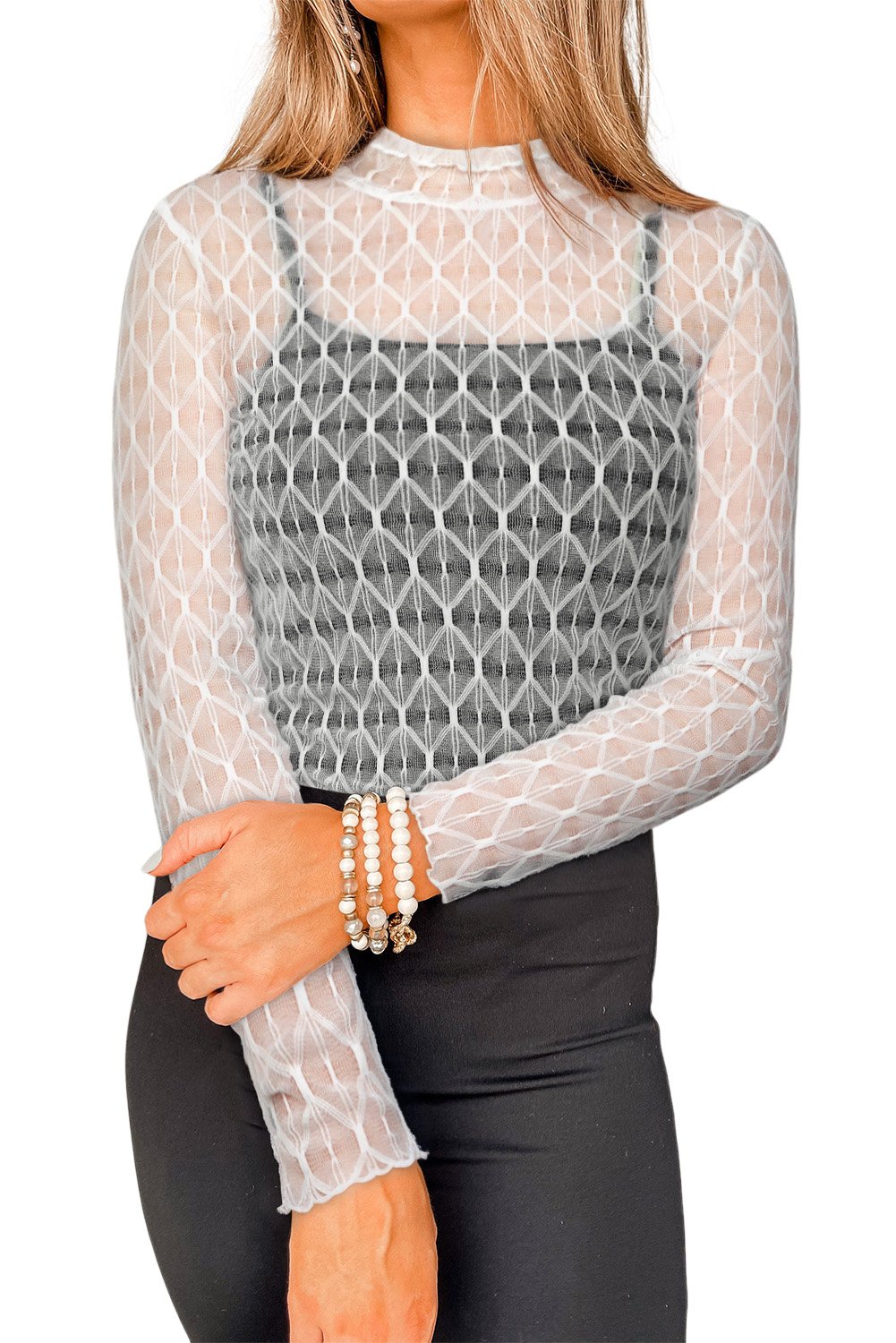 Beige Sheer Mesh Patterned Lettuce Trim Slim Long Sleeve Top