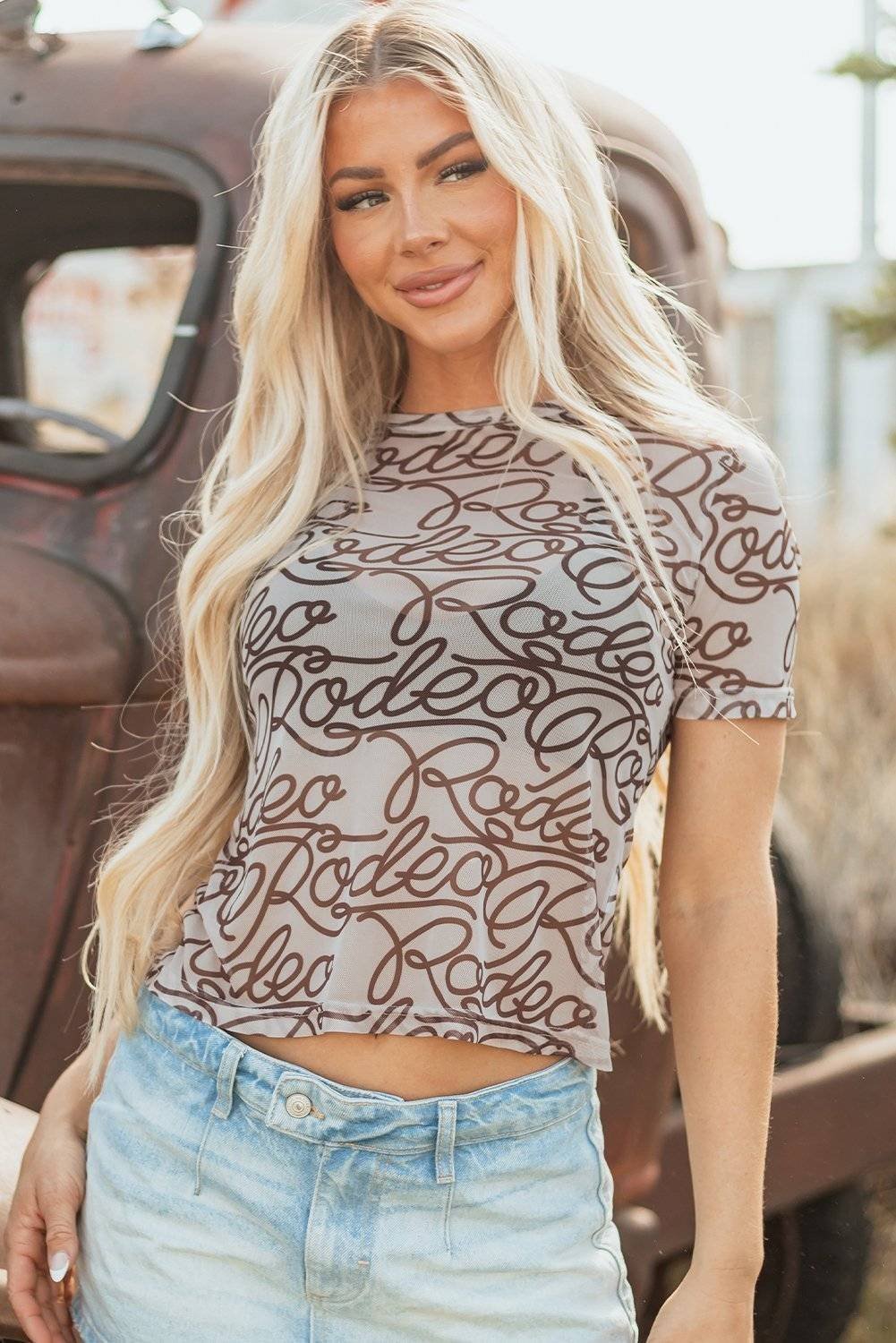 Brown Rodeo Print Round Neck Slim Fit Mesh T Shirt
